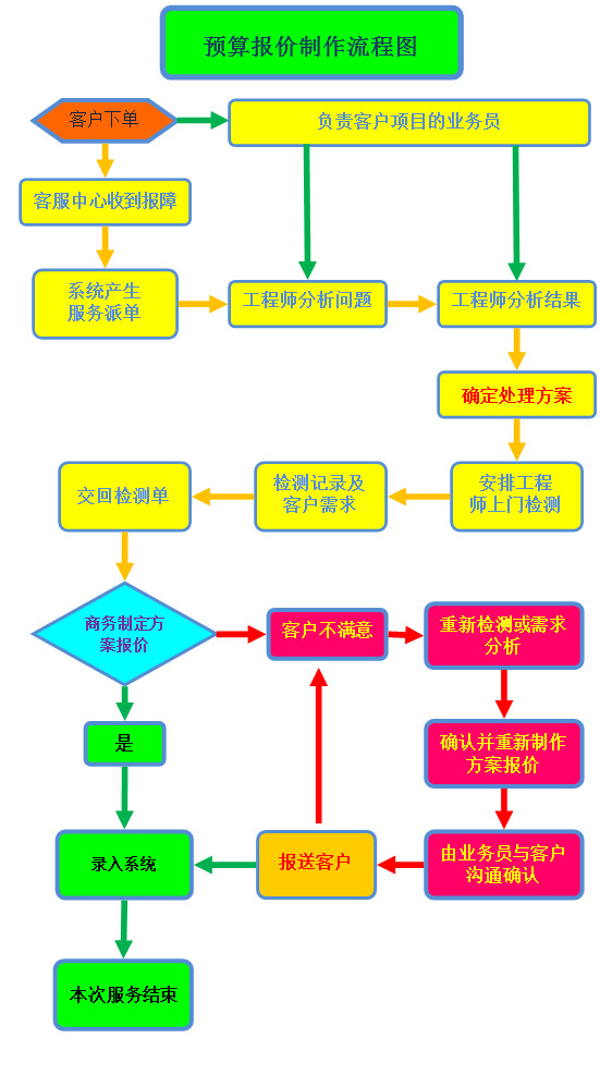 是在客户有预算类需求时,需要正规报价文件,或可实施方案时,通过 沟通或通讯手段解决,或需要技术人员到现场检测后才能确定的,由公司系统派单 或业务员直接下单,由现场技术人员,到客户设备使用地,对下单设备进行检测, 记录,并记录客户实际需求,带回公司,交由下单人,经商务制作解决方案及报价 文件,报送给客户,直到与客户沟通满意为止的一系列服务内容。为此我公司特制 定以下服务条款及上图所示流程图(适用于质保期以外问题处理流程)
