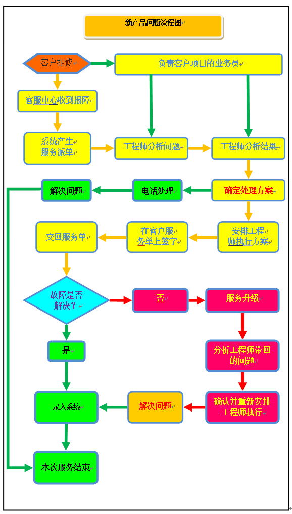 新产品问题大多出现在硬件上,对于新品,公司备品配件充足,处理速度 相对老产品更加快捷,凡本公司售出产品,终生享受本公司提供的快捷的售后服 务,为保障用户可以享受到快捷的售后服务,我公司特制定以下服务条款及上图 所示流程图(适用于新产品售后问题处理流程).