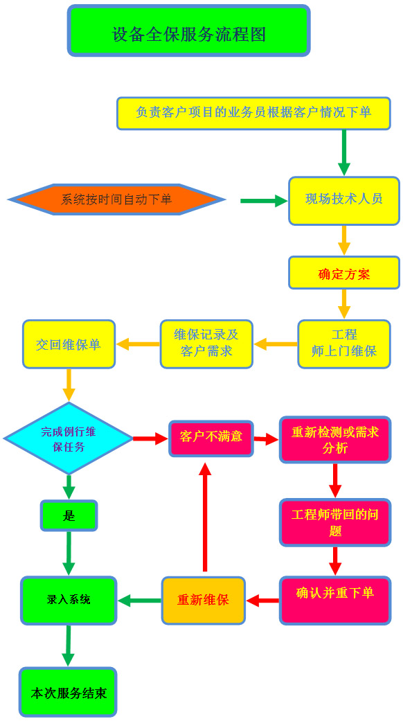 设备全保服务是针对购买了“设备全保”服务的客户,按照项目的不同 情况,有针对性的制定设备维护,维修等的服务,一般以时间为节点,定期进行, 如客户无特殊要求,公司系统会按预定时间节点进行自动派单,由现场技术人员, 到客户设备使用地,对设备全保范围内的设备进行维护,维修服务,如客户不满意, 重复以上工作,直到与客户沟通满意为止的一系列服务内容。定期维保是为了更好 的提供产品或服务的售后行为,专业的技术人员定期维保检测项目的情况,并做出 专业的使用,维护指导,一方面可以保障客户设备安全稳定运行,另一方面可以有 效减少项目售后频发问题,为此我公司特制定以下服务条款及上图所示流程图