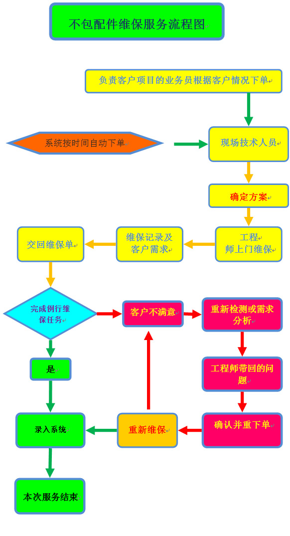 不包配件维保服务是针对购买了不包配件维保服务的客户,按照项目的 不同情况,有针对性的制定设备基本维护的服务,一般以时间为节点,定期进行, 如客户无特殊要求,公司系统会按预定时间节点进行自动派单,由现场技术人员, 到客户设备使用地,对不包配件维保范围内的设备进行检测服务,记录,并记录客 户实际需求,带回公司,交由下单人,经商务制作维保检验文件,报送给客户,如 客户不满意,重复以上工作,直到与客户沟通满意为止的一系列服务内容。定期维 保是为了更好的提供产品或服务的售后行为,专业的技术人员定期维保检测项目的 情况,并做出专业的使用,维护指导,一方面可以保障客户设备安全稳定运行,另 一方面可以有效减少项目售后频发问题,为此我公司特制定以下服务条款及上图所 示流程图